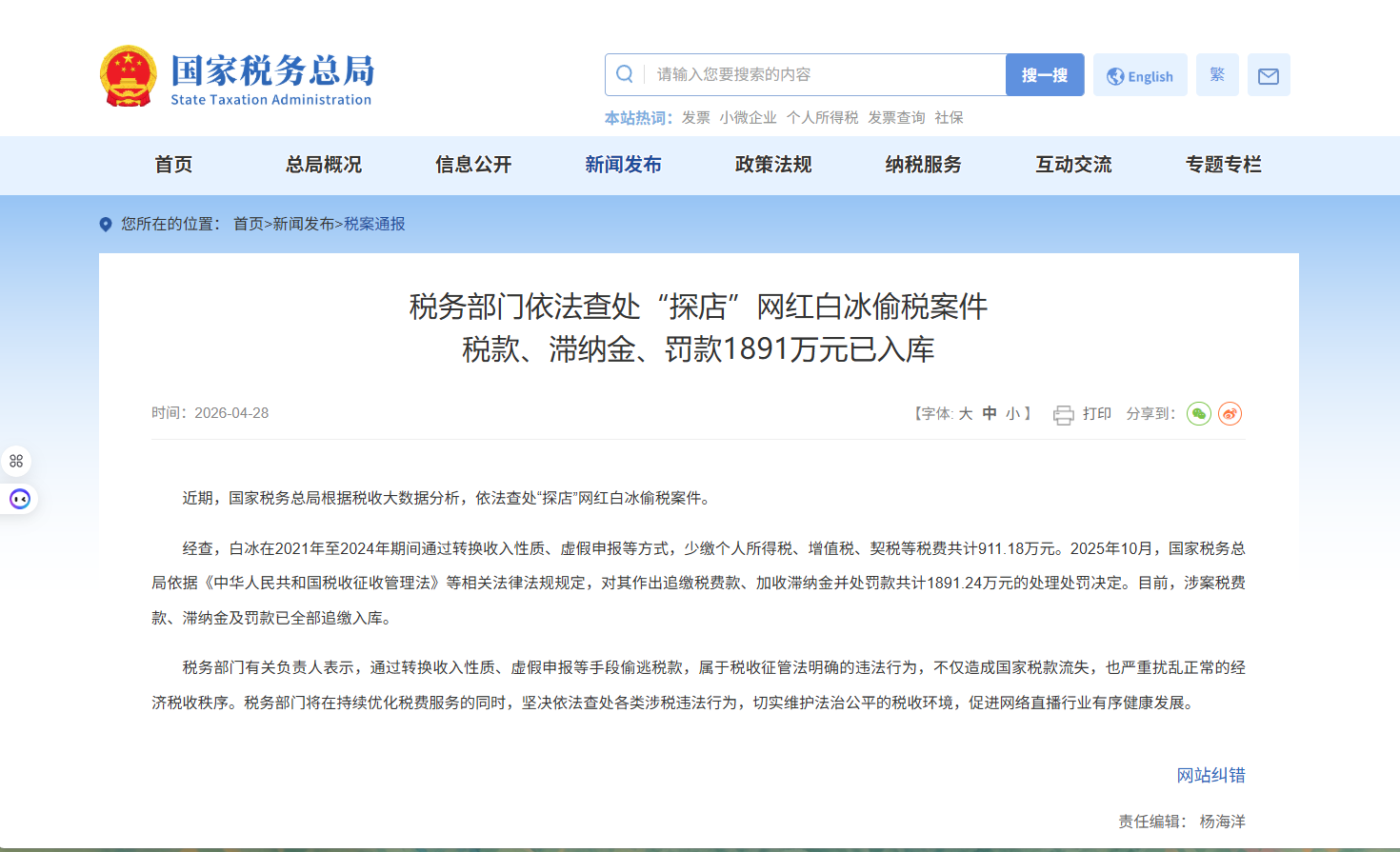 昨日(4月28日),国家税务总局官方通报了一起重磅涉税案件:全网拥有超4000万粉丝的美食探店类头部网红白冰,因偷逃税款被依法查处,追缴税款、滞纳金及罚款合计高达1891.24万元。作为税务总局直接查处并公开曝光的首例网红偷税案,此事件释放出了一个极其强烈的监管信号:在“以数治税”的大数据时代,任何试图通过“灰色操作”规避纳税义务的行为,都必然会被系统精准捕捉并付出惨痛代价。